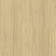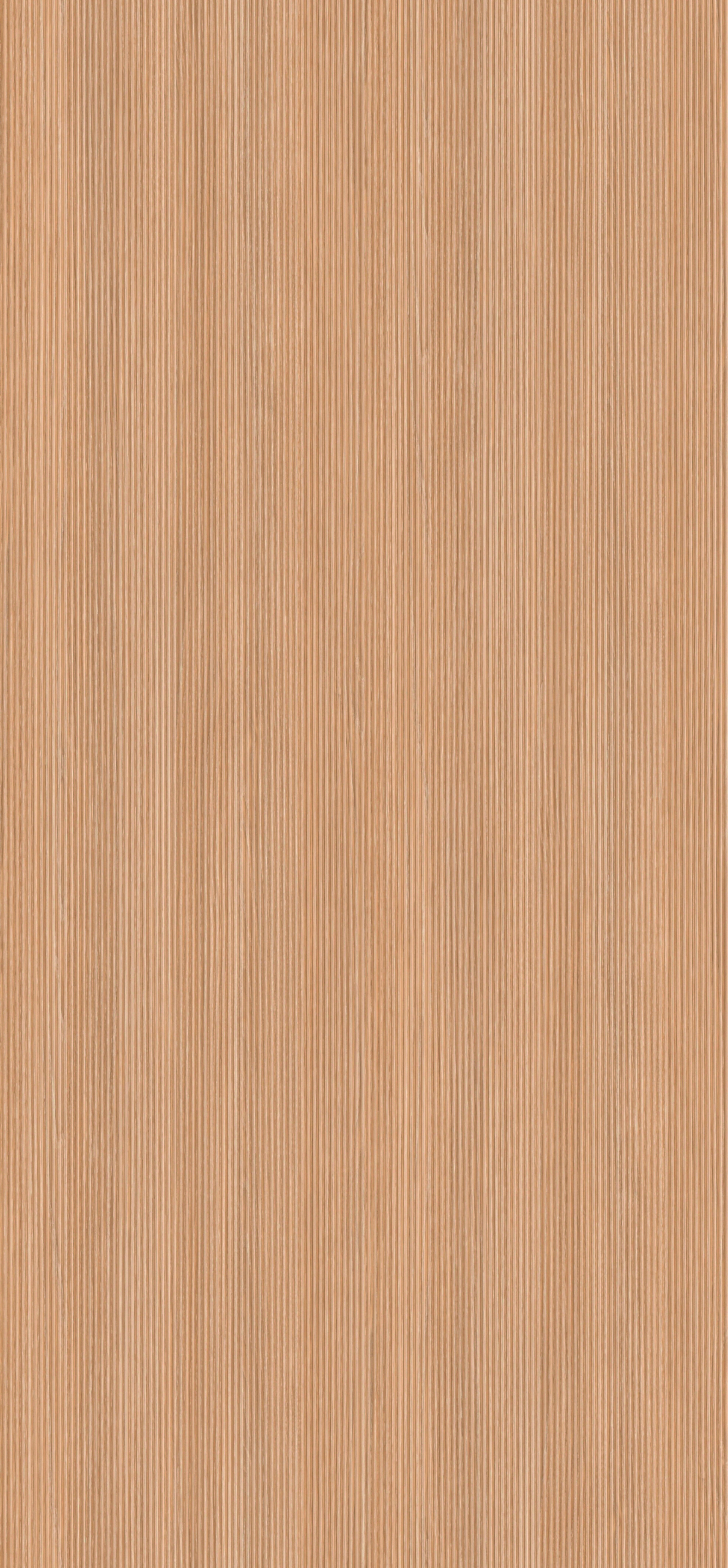Façades en mélaminé structuré décor orme clair et en mélaminé mat curcuma, plan de travail en stratifié argile, poignées modèle Vintage.