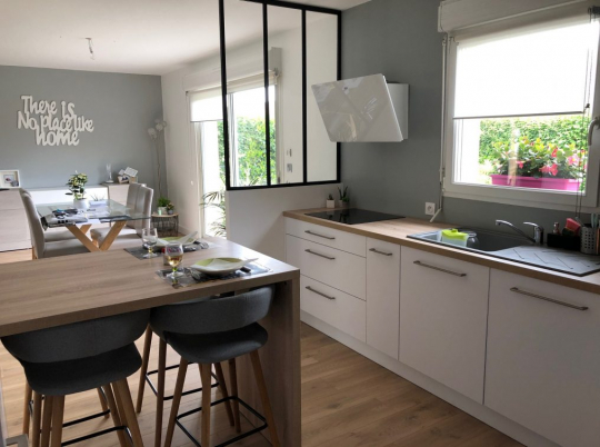 Réalisation COMERA Cuisines Le Mans – Cuisine semi-ouverte en L avec coin repas sur l’îlot central, modèle COMERA Loft d’inspiration scandinave avec verrière intégrée.