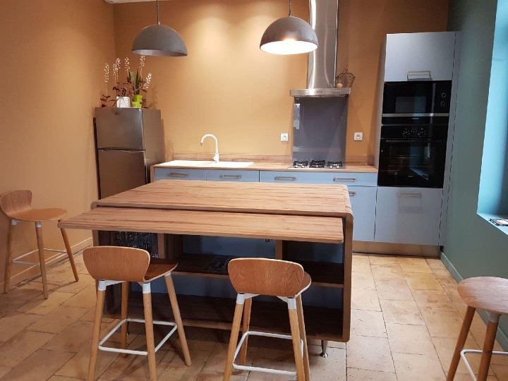 Réalisation COMERA Cuisines Montauban. Cuisine en I avec un îlot style vintage avec rangement et système de rallonge pour augmenter la surface du coin repas.