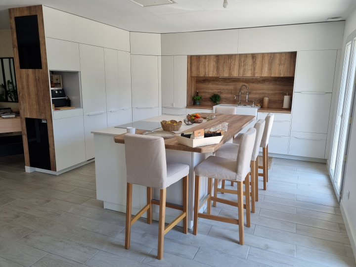 Dans cette réalisation COMERA Cuisines Carquefou, le mariage du blanc mat et du bois naturel crée une atmosphère à la fois contemporaine et chaleureuse.