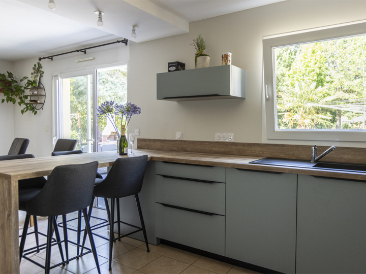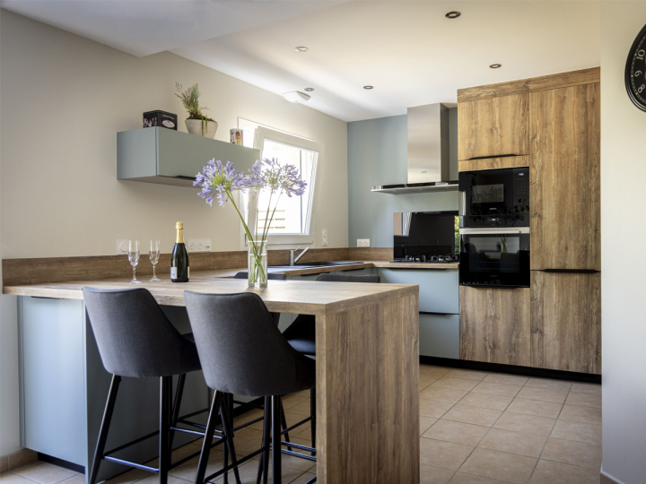 Le plan de travail, généreux, s’étire en une élégante table bar propice aux instants de partage. Le choix des finitions – façades mates, poignées discrètes et électroménager noir encastré – confère à l’ensemble une allure résolument contemporaine, sans jamais sacrifier l’ergonomie.