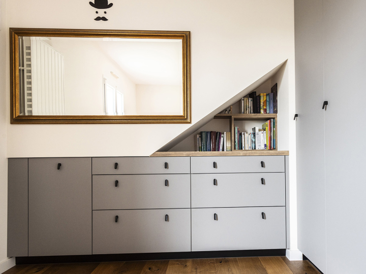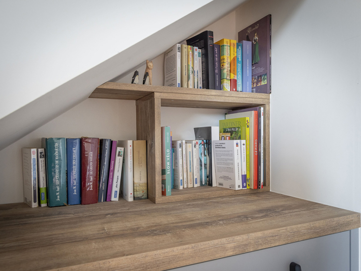 La structure en angle, adossée à un mur incliné, révèle un jeu de volumes astucieux : d’un côté, des tiroirs profonds offrent un vaste espace de rangement, tandis que de l’autre, une armoire haute optimise la verticalité du mur. Entre les deux, une niche bibliothèque insuffle une touche de légèreté et de personnalité.