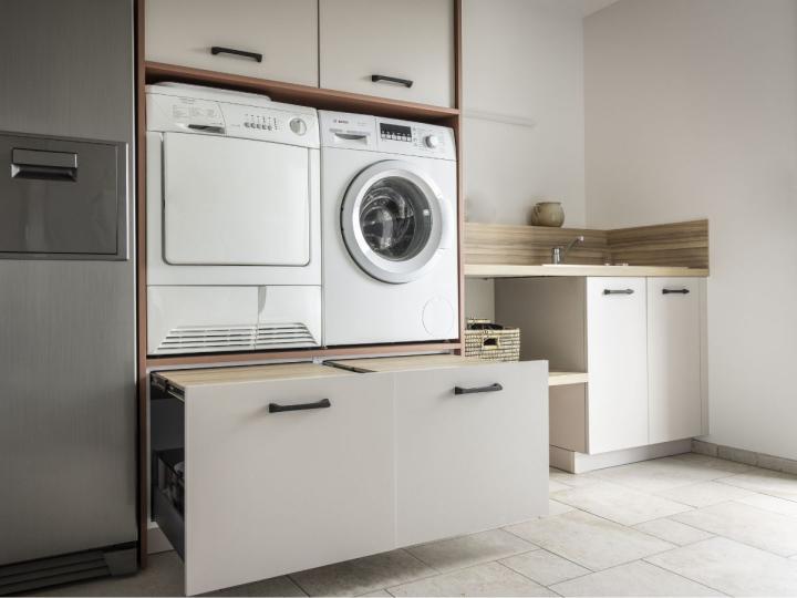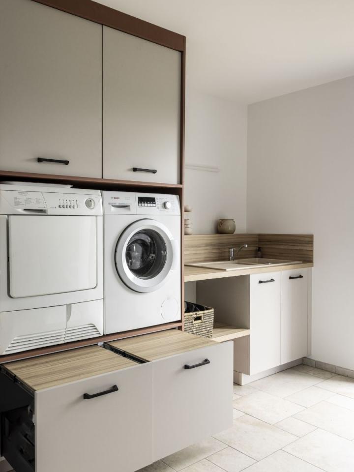 Les espaces de rangement encadrent discrètement le lave-linge et le sèche-linge, offrant une intégration harmonieuse de l’électroménager tout en libérant de l’espace visuel.