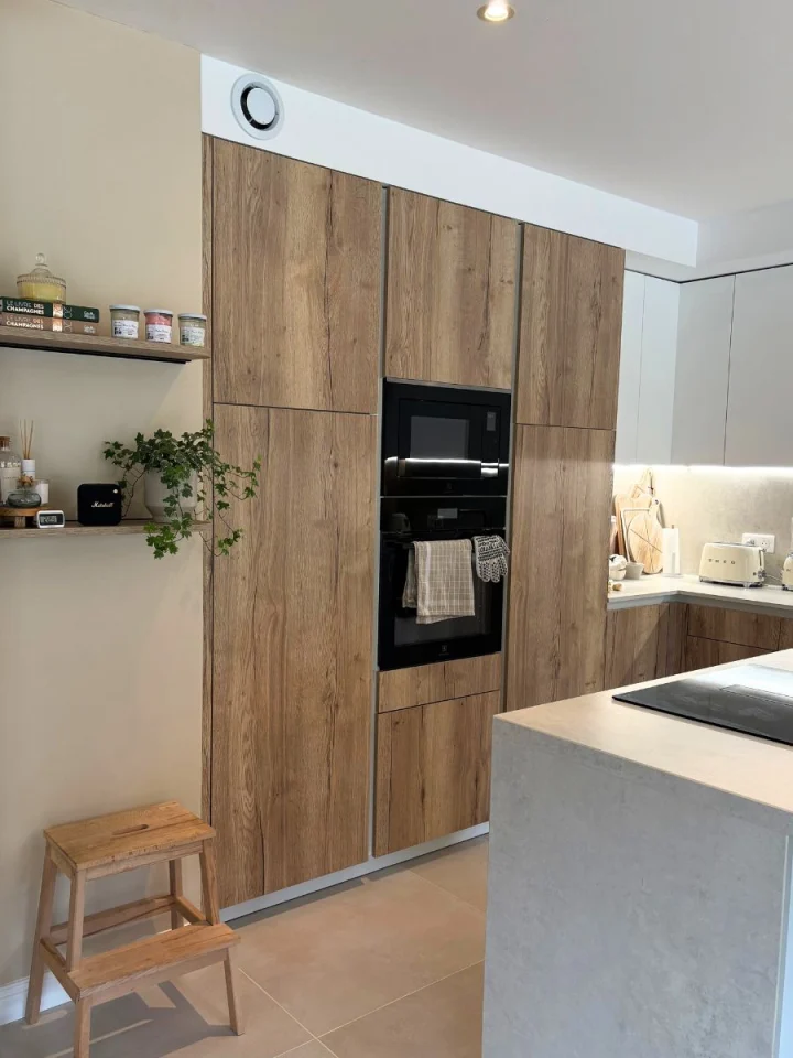 Toute la technologie électroménagère s’efface derrière des colonnes en bois massif pour laisser place à une esthétique lisse.