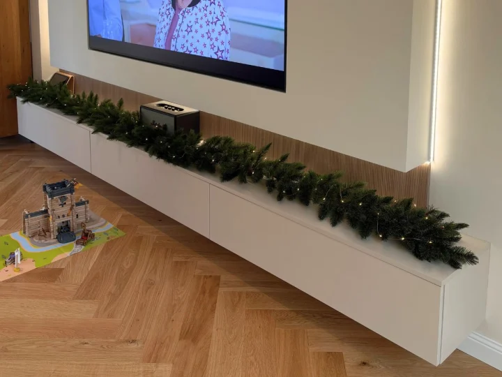 Le meuble TV suspendu reprend les codes graphiques de la cuisine — blanc épuré et bois cannelé — créant une continuité visuelle parfaite et une sensation d’espace décuplée.