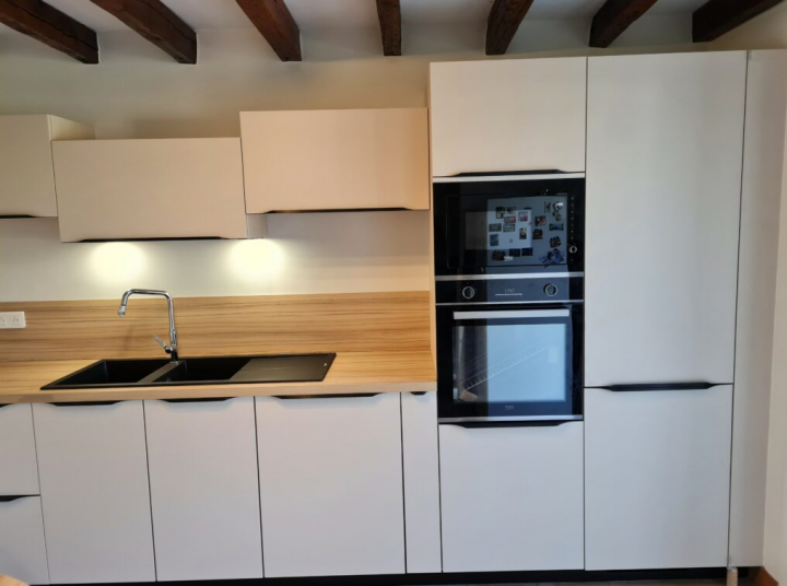 Les éléments hauts de couleur poudre apportent de la douceur et de la chaleur aux meubles bas couleur cœur de coco. Leur agencement non linéaire permet un certain dynamisme à l’ensemble.