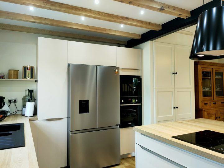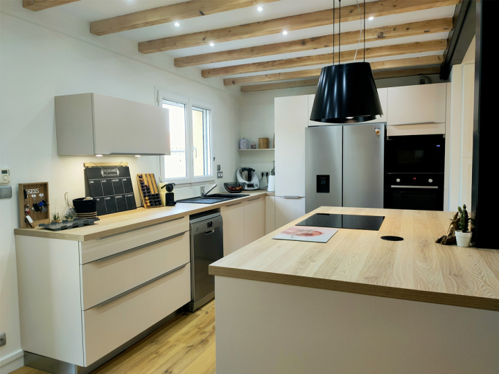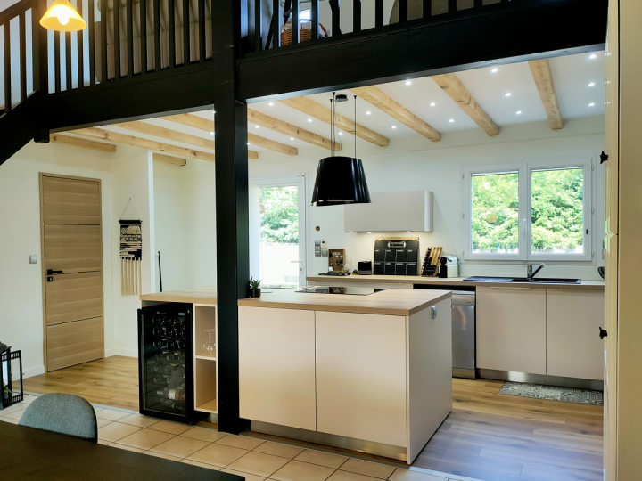 Véritable centre névralgique de la cuisine, l’îlot se pare d’un plan de travail en bois clair qui fait écho aux poutres du plafond. Il accueille à la fois la plaque de cuisson, une cave à vin intégrée et un vaste plan repas. Cet îlot multifonction, à la fois esthétique et ergonomique, invite à la convivialité et à la détente. Chaque détail a été pensé pour combiner style et praticité au quotidien.