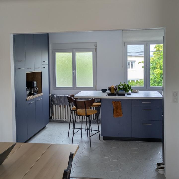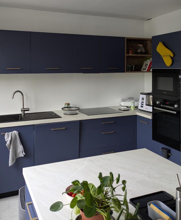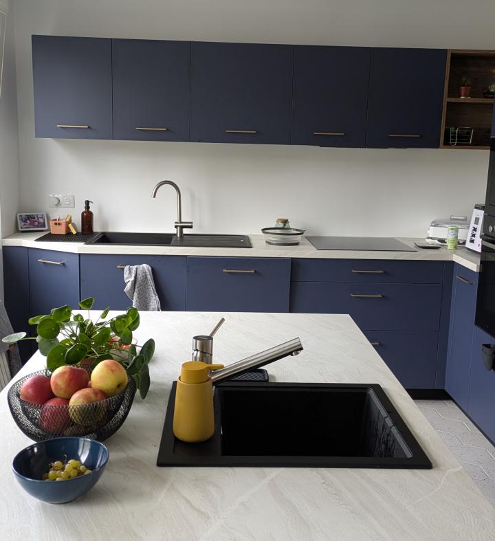 Ce contraste fonctionne avec justesse : le bleu structure, la pierre illumine. Résultat, une cuisine élégante, contemporaine et chaleureuse à la fois.