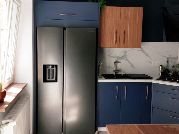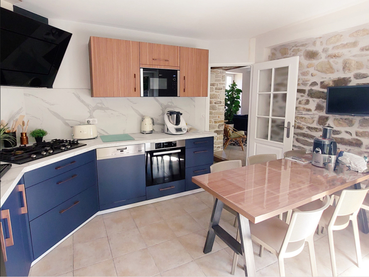 Dans cette maison au charme authentique, COMERA Cuisines Sautron a imaginé un espace culinaire qui joue habilement sur les contrastes. Le mur en pierre apparente, chargé d’histoire, dialogue avec des façades bleu profond aux lignes contemporaines, relevées d’une note chaleureuse grâce aux touches de cannelle boisée. L’ensemble crée une atmosphère unique, à la fois ancrée dans le caractère de la maison et résolument modernisée.