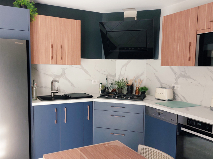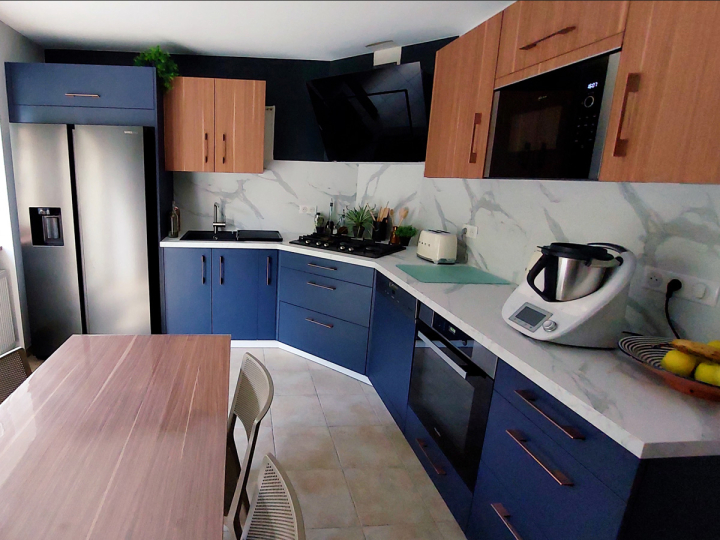 La composition en angle optimise intelligemment l’espace, tout en intégrant les équipements avec élégance : four encastré, micro-ondes intégré, plan de travail clair effet marbre… Chaque élément trouve naturellement sa place, sans alourdir la perspective. Le coin repas, avec sa table effet bois verni au piétement industriel, invite à la convivialité et prolonge la cuisine vers un véritable lieu de vie.