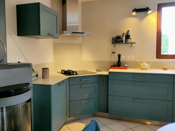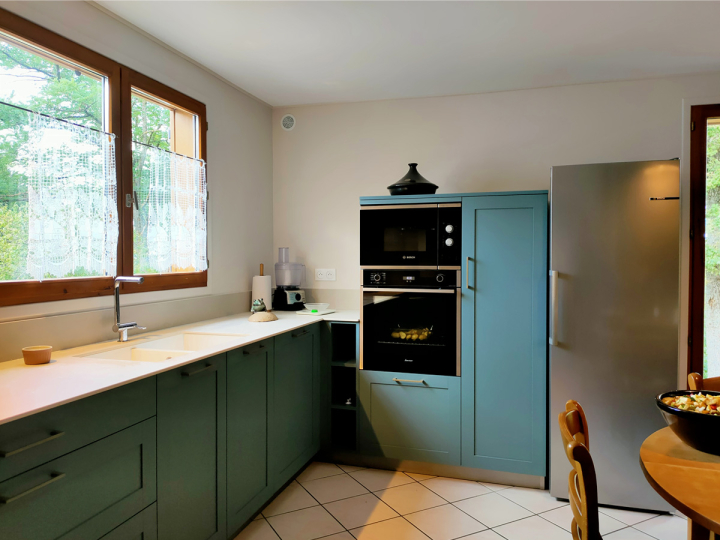 Les fenêtres en bois laissent entrer une belle lumière naturelle, sublimant les nuances du bleu et la texture mate des meubles. Le jeu de contraste entre les surfaces colorées et le carrelage clair crée une ambiance sereine et conviviale, idéale pour une cuisine de vie familiale. La disposition en L favorise la circulation et rend l’espace fonctionnel, accueillant et harmonieux.