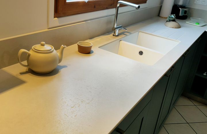Cette cuisine s’inscrit dans la tendance du style campagne chic, où la tradition se marie à la modernité. Les lignes structurées et les poignées sobres modernisent la façade à cadre, tandis que les électroménagers encastrés et les finitions soignées apportent confort et praticité au quotidien. Chaque détail — du mitigeur inox à la hotte design — a été pensé pour préserver le caractère authentique tout en assurant une ergonomie optimale.