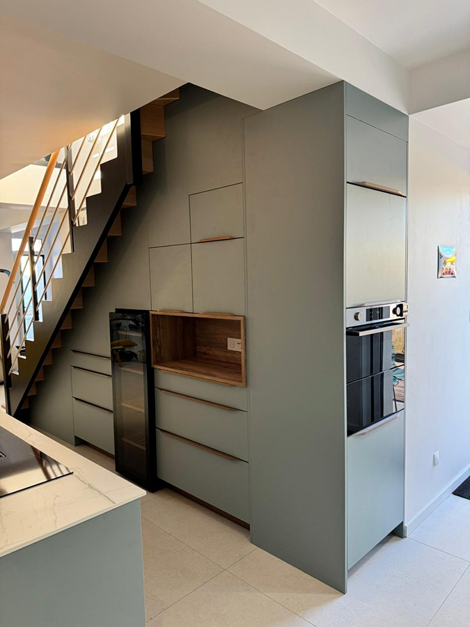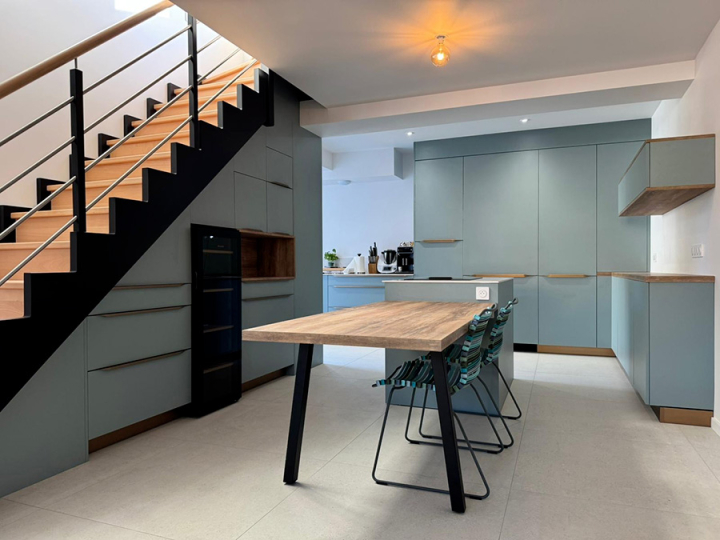 Sous l’escalier, cette cuisine bleu fjord sur mesure exploite chaque recoin avec une précision remarquable : rangements invisibles, niches décoratives et électroménager intégré. L’ensemble crée une continuité fluide, à la fois graphique et fonctionnelle.