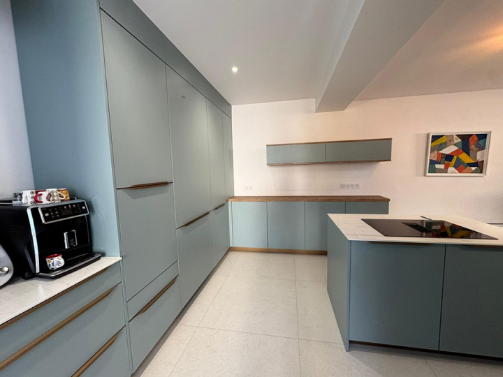 L’un des atouts majeurs de cette cuisine réside dans sa porte dissimulée, menant à une buanderie cachée dans le prolongement de la pièce. Ce détail d’architecture renforce l’harmonie visuelle et la sobriété des lignes. Les façades mates dans une teinte bleu-gris, subtilement rehaussées de touches boisées, apportent une atmosphère chaleureuse et contemporaine.
