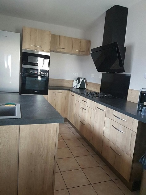 Cuisine COMERA aux façades mélaminées structurées coloris « chêne vintage » avec son plan de travail noir « Terre de Volcan »- Fond de hotte en verre trempé noir .