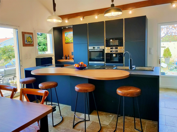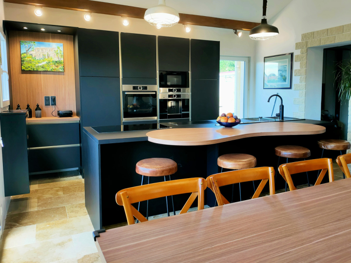 Dans cette réalisation signée COMERA Cuisines Montbrison, le charme du bois se marie à la sobriété du noir pour créer une cuisine contemporaine à l’esprit chaleureux et accueillant. Les façades mates, d’un noir profond, mettent en valeur le plan de travail et l’îlot aux courbes organiques, réalisés dans un bois clair à la texture douce et naturelle. Cette alliance de matériaux nobles confère à la pièce un équilibre subtil entre modernité et authenticité.
