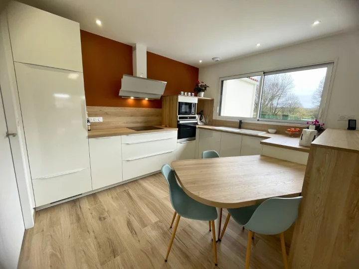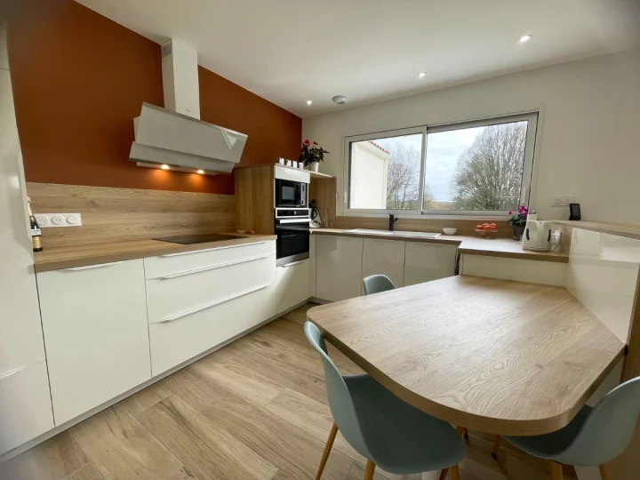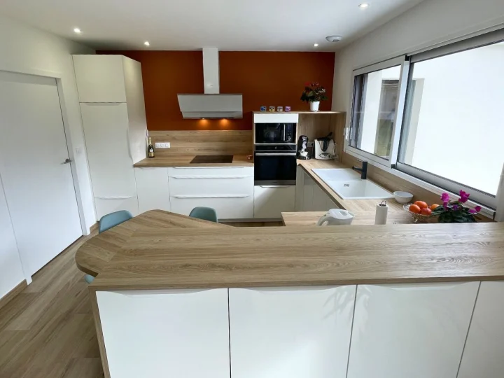 Il y a des mariages qui s’imposent comme une évidence. Dans cette réalisation signée Comera Cuisines les Herbiers, le terracotta s’invite en majesté pour réveiller la pureté des lignes. Ce choix de couleur forte, à la fois terreuse et solaire, crée un écrin de caractère qui met en lumière les façades crème et leur fini haute brillance. L’agencement a été pensé pour optimiser chaque mètre carré sans sacrifier la circulation. Le plan de travail en chêne blond file le long des murs et se prolonge en une table de repas intégrée aux courbes douces. Véritable pivot de la pièce, cet espace dînatoire invite à la convivialité tout en structurant la zone de préparation.