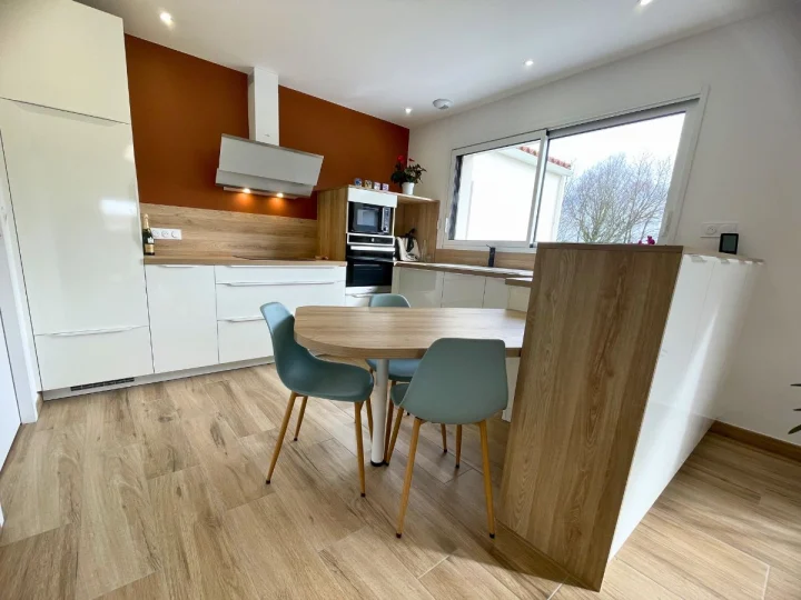 - L’espace dînatoire sur-mesure : Une table intégrée en chêne qui épouse les lignes de la cuisine, idéale pour les repas quotidiens.