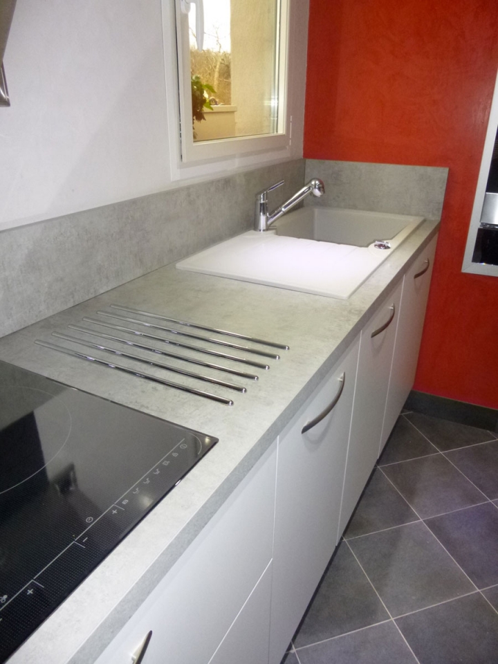Cuisine modèle Loft blanc givré plan de travail ciment réalisée à Bocquence