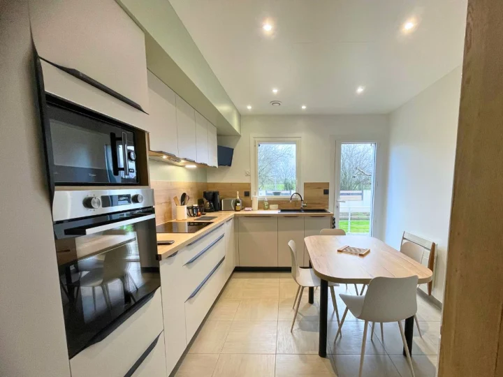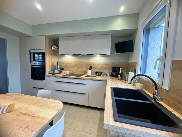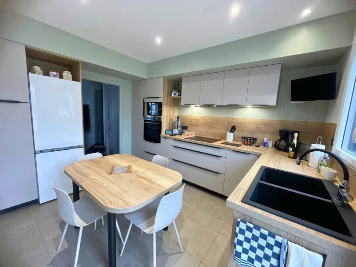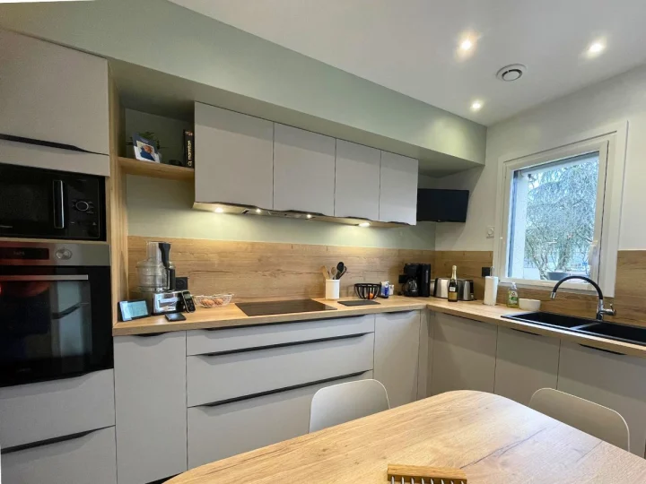 La table de repas attenante, avec son plateau bois en harmonie avec les plans de travail, invite à la convivialité dès le petit-déjeuner.