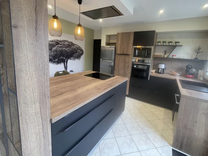 Dans cet espace, le mariage des matières est roi : la profondeur d’un noir mat texturé rencontre l’authenticité d’un bois de chêne aux veinages marquées.