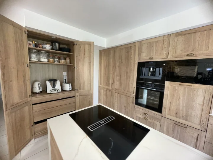 Cet espace invite au partage, tout en intégrant une plaque de cuisson avec hotte aspirante intégrée pour une vue dégagée sur le séjour.