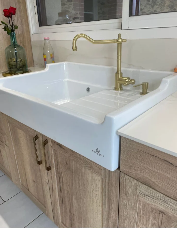 On craque pour l’évier timbre d’office en céramique blanche, véritable clin d’œil rétro, magnifié par une robinetterie en laiton doré.