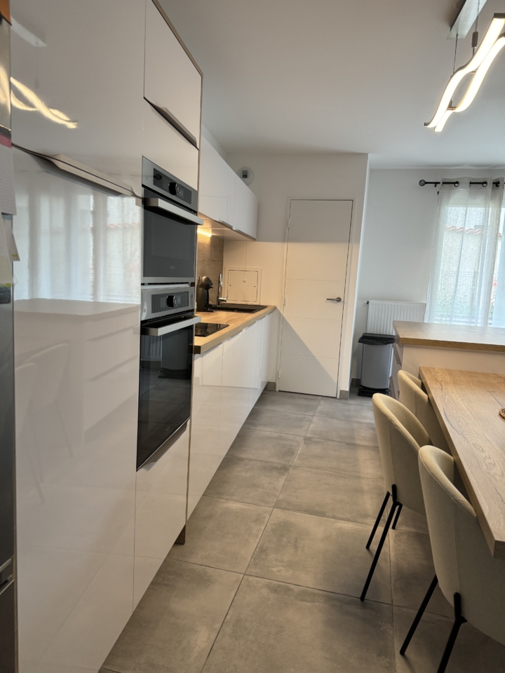 Cette cuisine moderne se distingue par ses façades blanches brillantes et son plan de travail en bois clair. L’implantation en L et l’îlot central offrent un espace de travail optimal et convivial. Les armoires épurées et les éclairages LED intégrés sous les armoires ajoutent à la fonctionnalité et à l’esthétique.