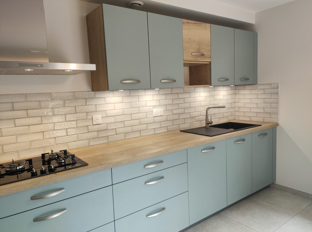 Une cuisine au style scandinave, où la fonctionnalité se marie à l’esthétique. Les teintes de bleu apportent une fraîcheur apaisante, tandis que les éléments en bois ajoutent chaleur et authenticité. Cet espace épuré incarne la simplicité élégante du design nordique, créant un environnement accueillant et pratique pour cuisiner et se réunir.