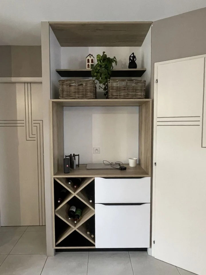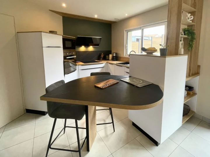 Le détail qui change tout : L’intégration d’un pôle « art de vivre » multifonction. Côté pile, un aménagement ingénieux avec cave à vin intégrée et niches déco pour accueillir vos plus beaux objets. Côté face, un îlot qui se prolonge en une table de repas aux courbes organiques, idéale pour les petits-déjeuners pressés ou les dîners qui s’éternisent.