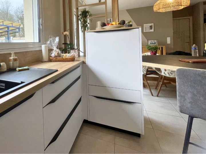 Des façades blanc pur au toucher velouté, soulignées par des gorges noires graphiques qui apportent du rythme et une touche résolument contemporaine. Le plan de travail, aux nuances de chêne naturel, réchauffe l’ensemble et invite à la convivialité.