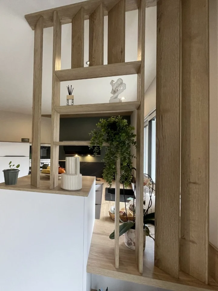 Pour cette réalisation signée Comera Cuisines, l’enjeu était de créer une transition fluide entre la zone de préparation et les pièces de vie. Le secret ? Une verrière en bois clair qui agit comme une dentelle architecturale, délimitant la cuisine tout en laissant circuler la lumière naturelle.