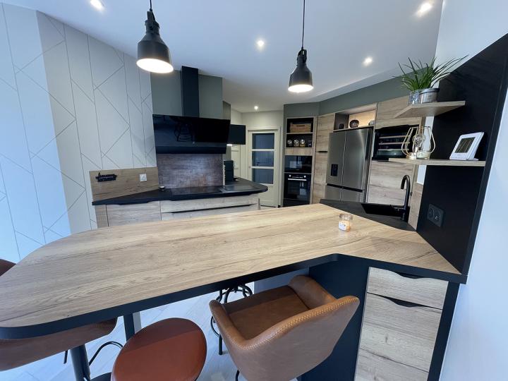 L’îlot central devient un véritable point d’ancrage : espace de travail généreux, zone conviviale et lien naturel avec le reste de la pièce.