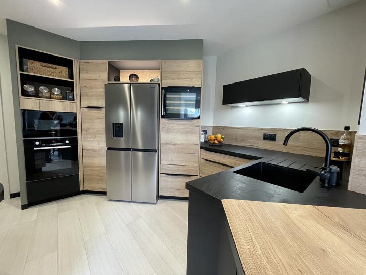 Les meubles en chêne vintage apportent texture et authenticité, tandis que les éléments noirs mats structurent l’espace et soulignent les lignes de la cuisine.