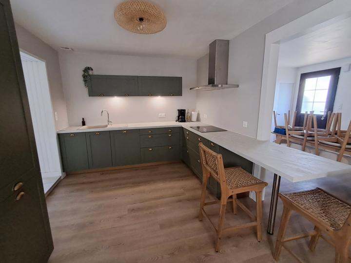 Le cœur de la cuisine s’organise autour d’un îlot central aux lignes sobres, véritable espace de partage et de préparation.