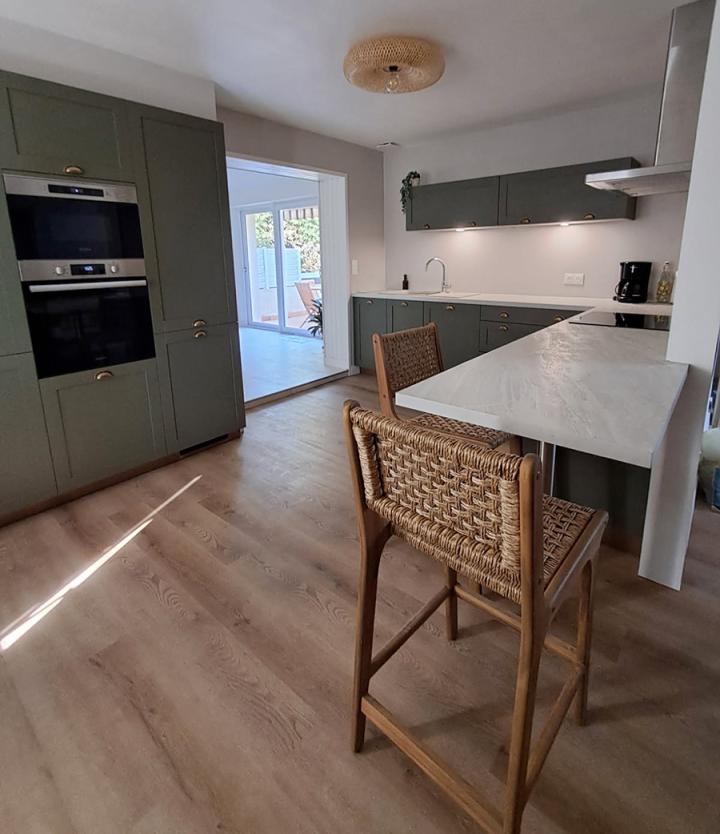 Les façades vert kaki, à la fois intemporelles et actuelles, apportent une atmosphère apaisante et naturelle, sublimée par des touches boisées et des finitions soigneusement choisies.