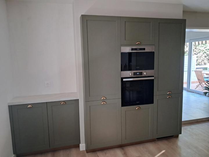 Les colonnes intégrant les appareils électroménagers offrent une lecture visuelle épurée, tandis que les linéaires bas et hauts assurent un rangement optimisé, pensé pour un usage quotidien confortable.