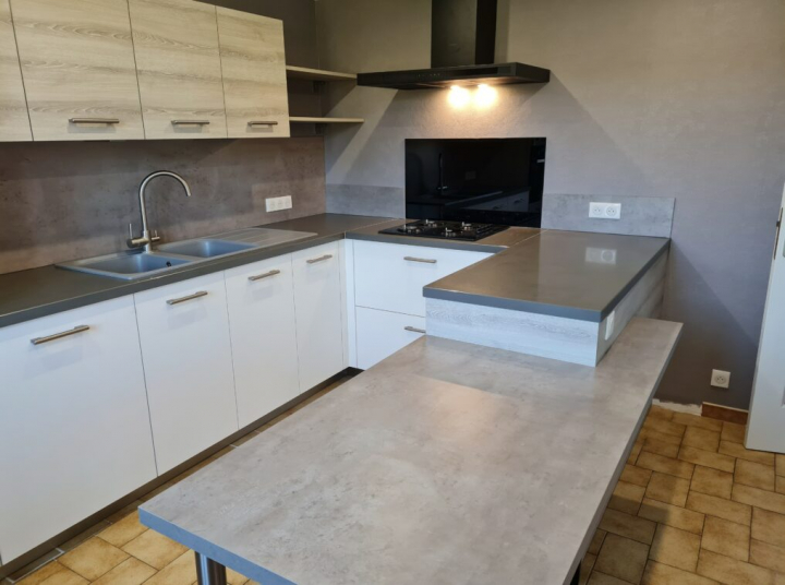 L’implantation en U de cette cuisine fermée assure une facilité d’utilisation au quotidien. Le coin repas un peu plus bas que le retour du plan de travail permet une séparation entre les deux espaces.
