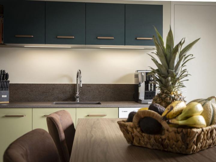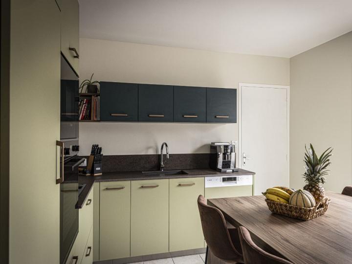 Le vert pistache des meubles bas apporte une luminosité douce et organique, tandis que les éléments hauts en bleu nuit structurent l’espace avec élégance.