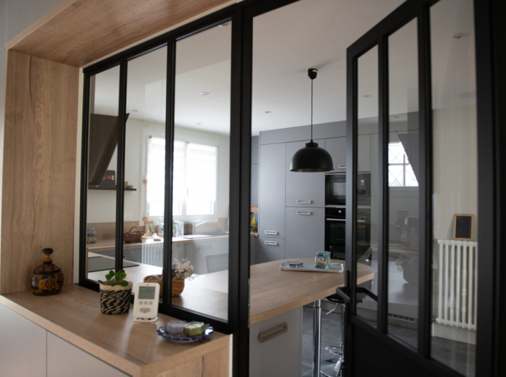 Ce placard d’entrée permet une séparation, à la fois pratique et esthétique, entre le couloir d’entrée et la cuisine. Il est agrémenté d’une grande verrière noire offrant de la luminosité à la cuisine, ainsi qu’une séparation avec la salle à manger.