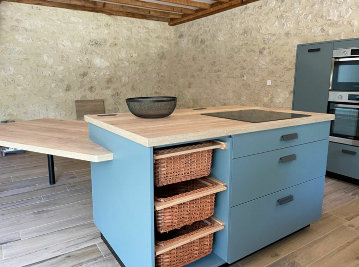 Les murs en pierres donnent un charme certain à cette cuisine bleue, implantée en L. Son îlot central atypique sur deux hauteurs ajoute du volume et une jolie touche d’originalité.