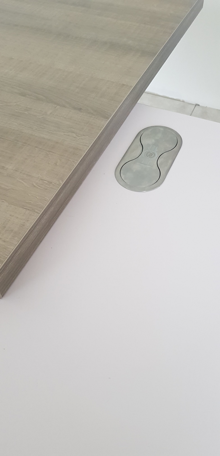 Symétrie des formes, grand plan de travail, îlot avec table surprenante et suspendue, tout y est ! Petit focus sur le bloc prises en inox avec une ouverture en touche-lâche !