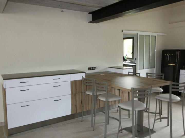 Cette vaste cuisine a été réalisée par le magasin COMERA Cuisines Villeréal (47). Une cuisine fonctionnelle avec des multiples rangements.